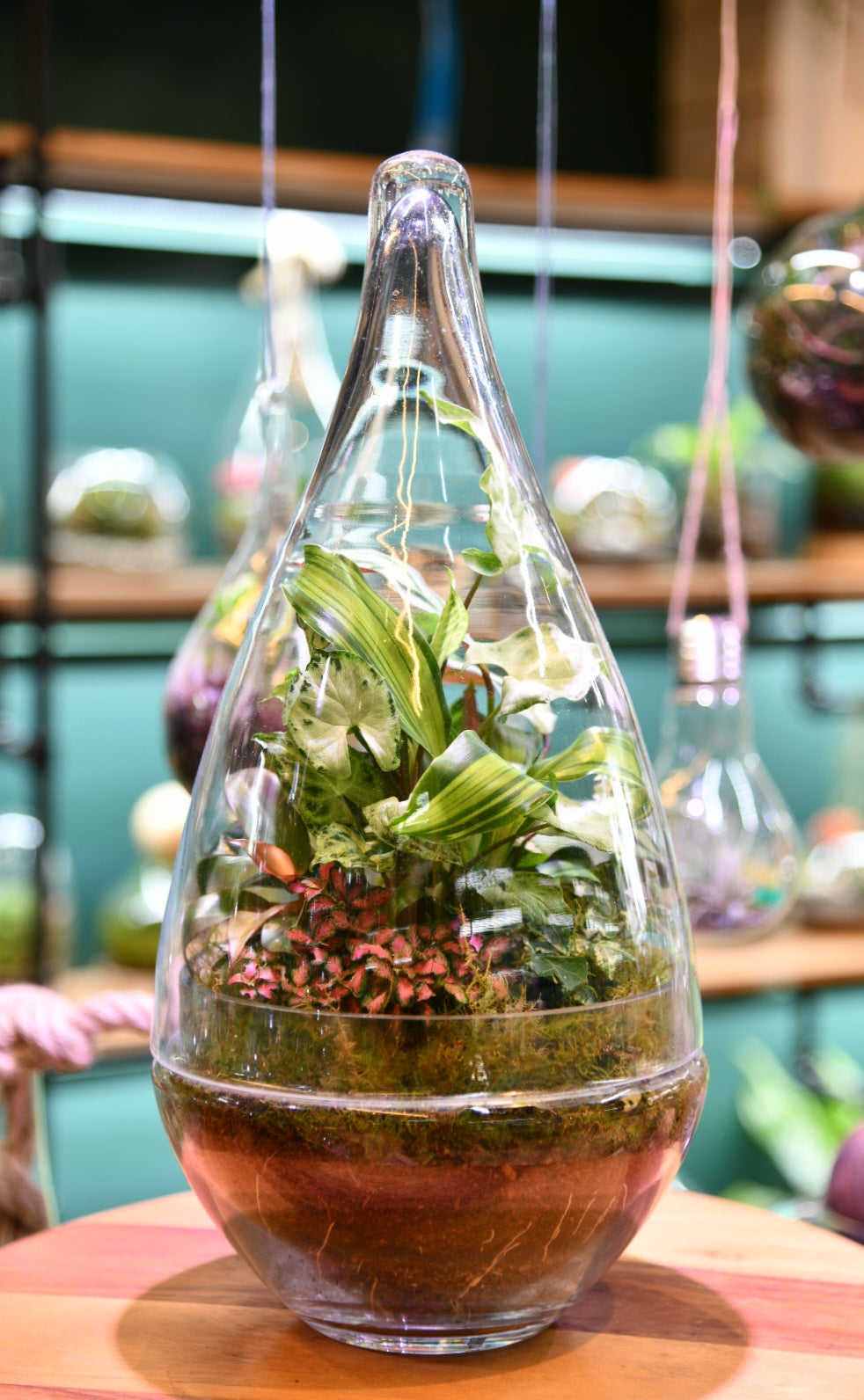 A beautifully balanced enclosed terrarium in an elegant teardrop-shaped glass vessel. Planted with a carefully selected mix of tropical plants and moss, this miniature ecosystem creates a lush living display that thrives with minimal care.
